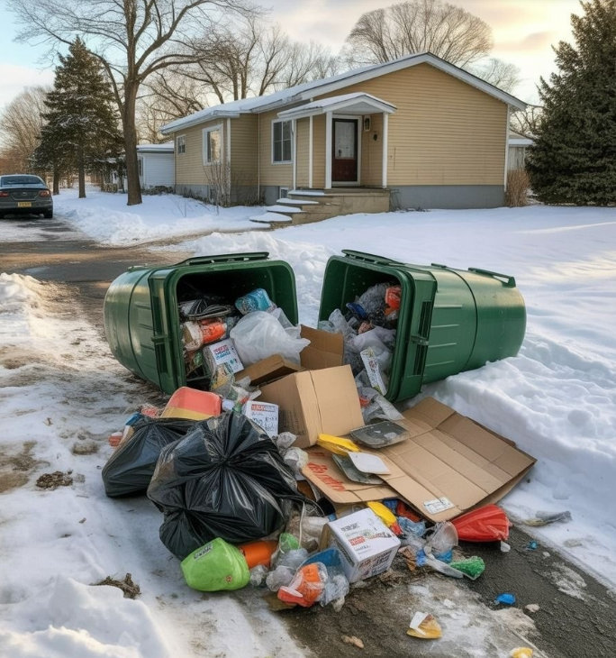 Il s'agit d'un complément à votre conjoint, qui n'a pas réussi à le faire. W naszym miasteczku odbiór śmieci zimą jest utrudniony przez ogromne zaspy śnieżne. Pługi tworzą wysokie bariery przy drogach, ograniczając miejsce, w którym można wystawiać pojemniki. Wszyscy muszą się dostosować — ustawiać kosze bliżej granicy posesji, pod odpowiednim kątem, tak aby śmieciarki miały do nich dostęp.