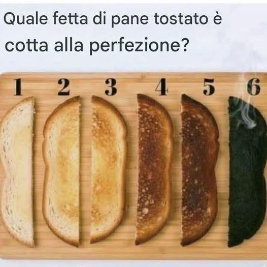 Na pierwszy rzut oka obraz wydaje się prosty: sześć kromek tostu, starannie ułożonych and ponumerowanych od 1 to 6, z których każda reprezentuje inny poziom wysmażenia. Kromka 1 jest lekko opieczona, jasna i miękka, a kromka 6 jest całkowicie spalona, ciemna i dymiąca. Pytanie nad obrazkiem – « Która kromka tostu jest idealnie opieczona ? » – wydaje się zabawne, ale jednocześnie skłania do zaskakująco głębokiej refleksji.