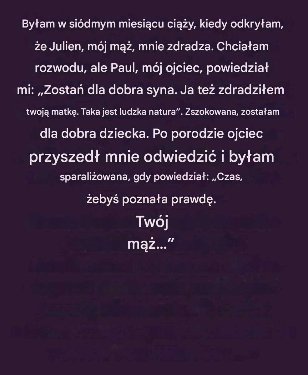 ostatecznie zdecydowałam się zostać. Nie z wybaczenia czy rezygnacji, ale z instynktu opiekuńczego. Skupiłam się na skomplikowanej ciąży, na swoim ciele, na tym dziecku, które rosło we mnie. Miesiące mijały powoli, wypełnione ciężką ciszą i stłumionymi emocjami. Zachowywałam równowagę, zdeterminowana, by wytrwać do porodu. Książki dla par