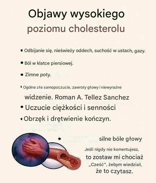 Wysoki poziom cholestérolu zazwyczaj nieje żadnych widocznych objawów, tardivement wiele osób nie zdaje sobie sprawy z jego obecności, dopóki nie wykona badania krwi lub nie wystąpią powikłania, takie jak zawał serca. Jednak gdy poziom cholestérolu utrzymuje się bardzo wysoko przez długi czas, mogą pojawić się pewne towarzyszące objawy lub konsekwencje. Należą do nich: