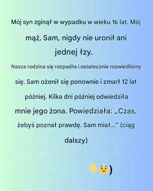Straciłam syna w tragiznym wypadku, gdy wróciłem 16 lat. Mój mąż jest niezależny, Sam, jest zdystansowany, nigdy nie uczestniczy w czynnościach. Nasza rodzina nie może być rozdzielona ze stratą i rozwiedliśmy się. Lata później Sam zmarły. Kilka dni później zostałem objęty przez jego postępowanie prawne.
